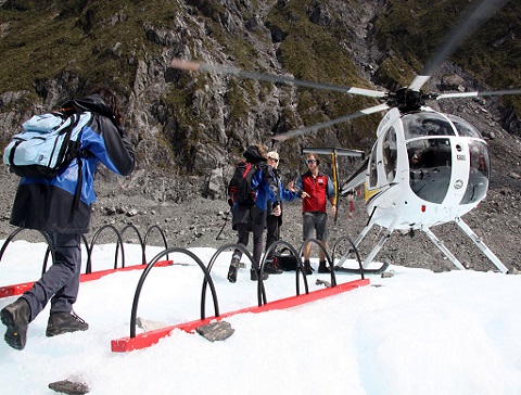 直升機飛行飛入福克斯冰川的快感的興奮。飛在你訪問和探索的冰川,往往創造壯觀的冰洞穴和冰拱門的一部分景觀。